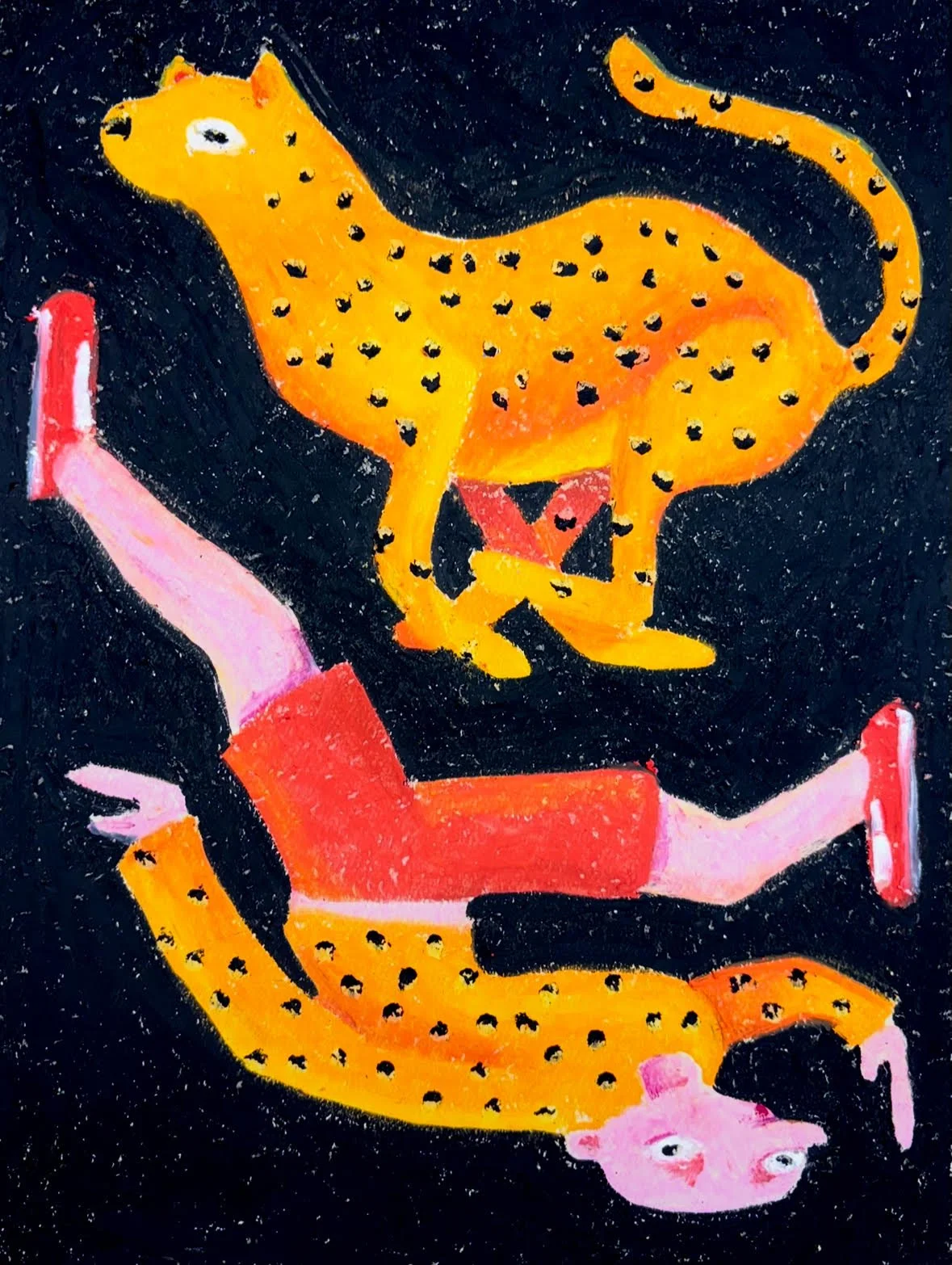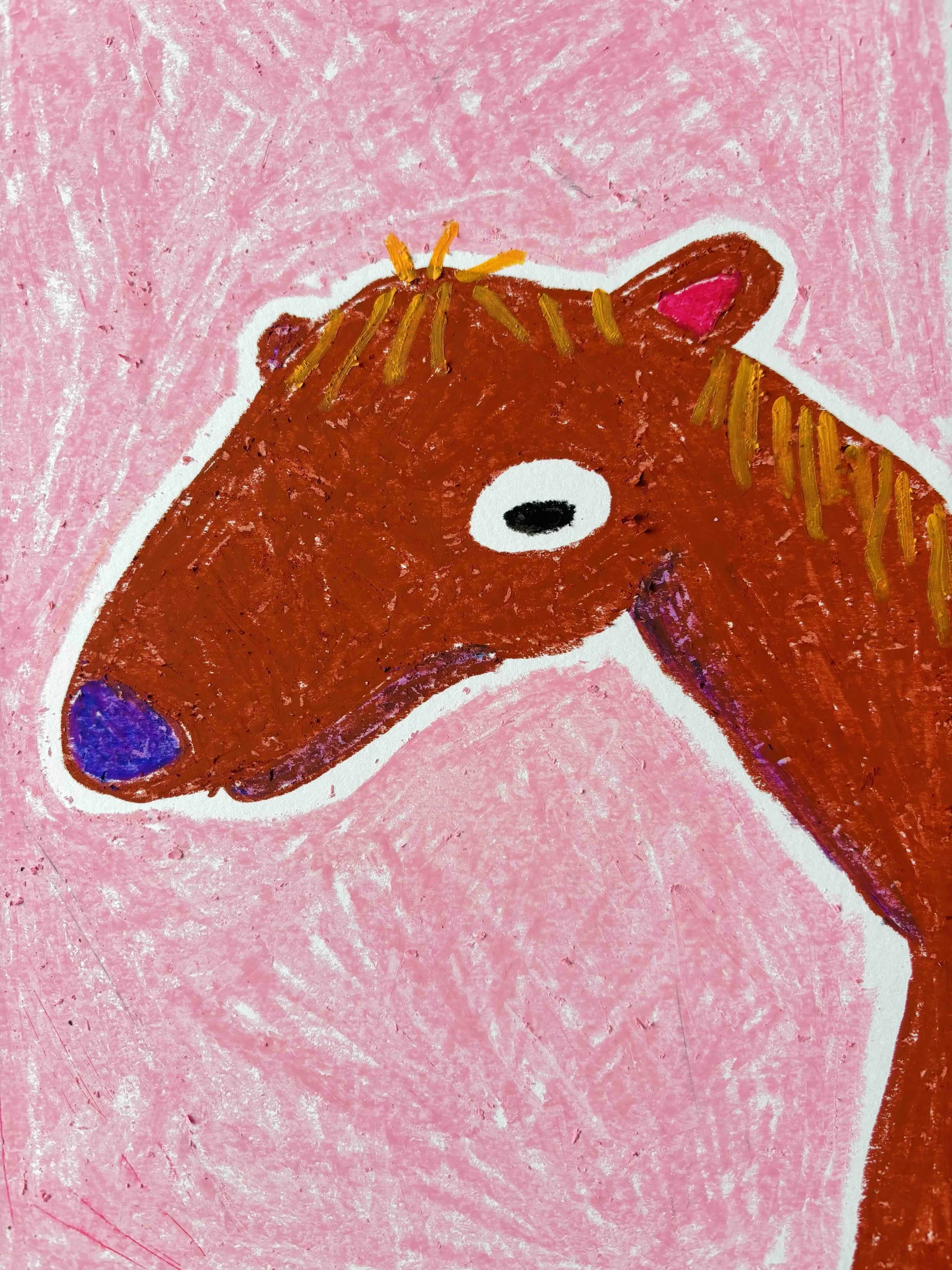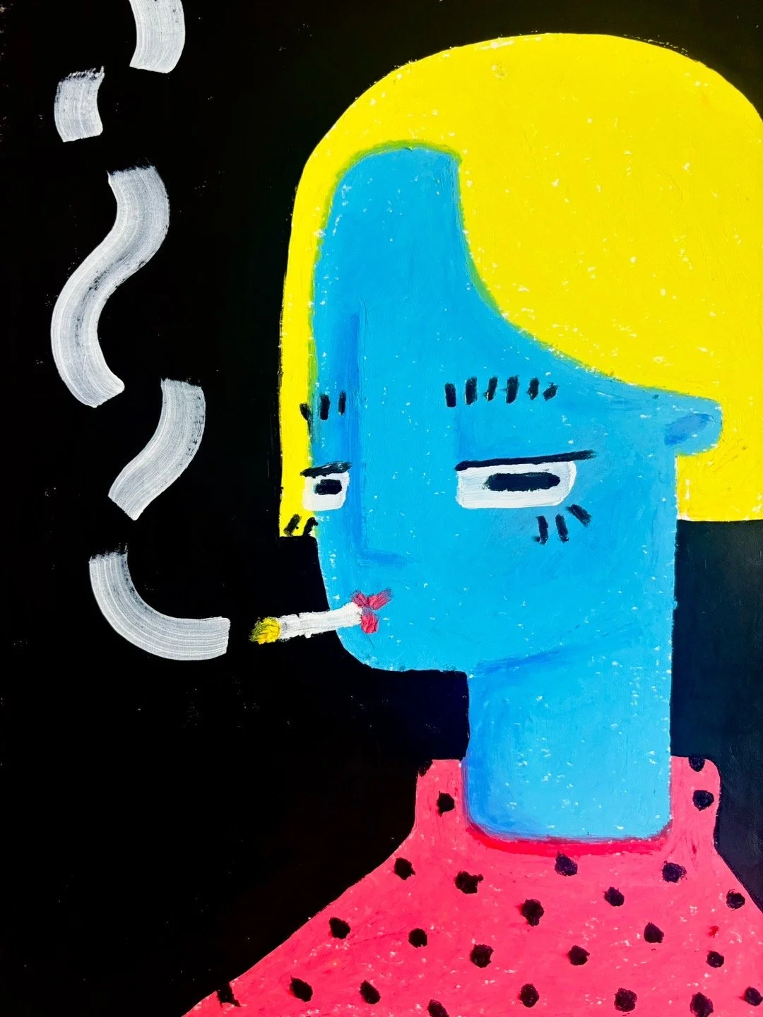 Even with the switch to oil pastels her style remains consistent, it kind of reminds us of old Nickelodeon cartoons from the 90s, but with bolder colours. “I would describe my style as bright, bold and unafraid of being itself. I like the idea that my work can be quite funny and charming at first glance, but the longer you look, the more unsettled you may become. I think the nature of my work is rooted in curiosity, which adds to the oddity.”