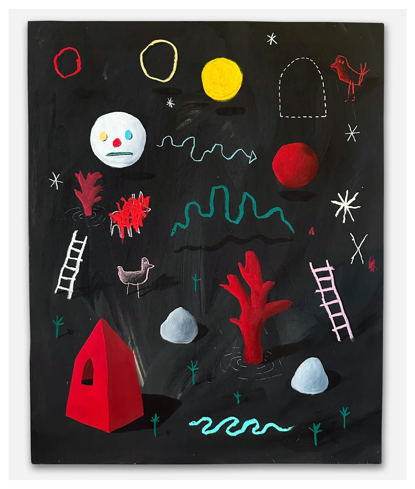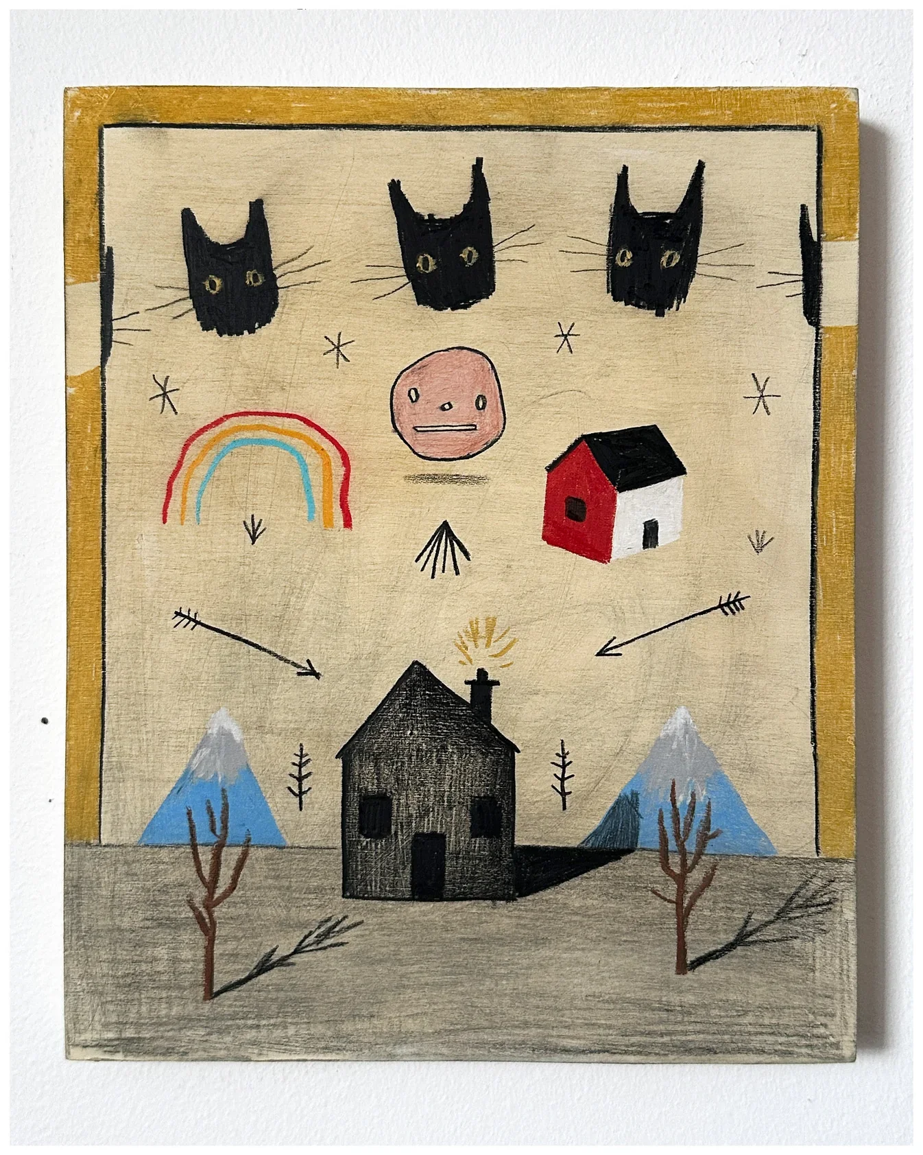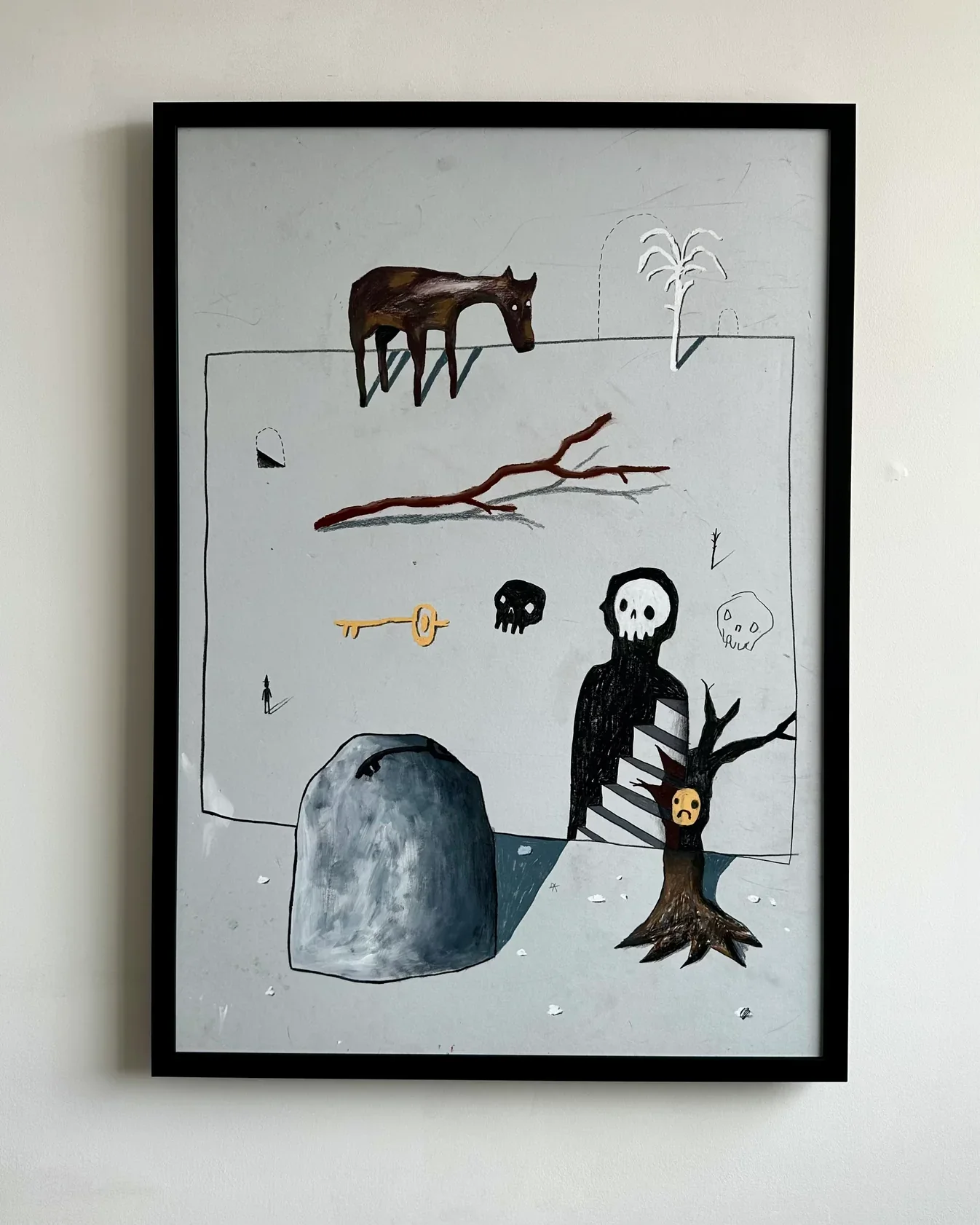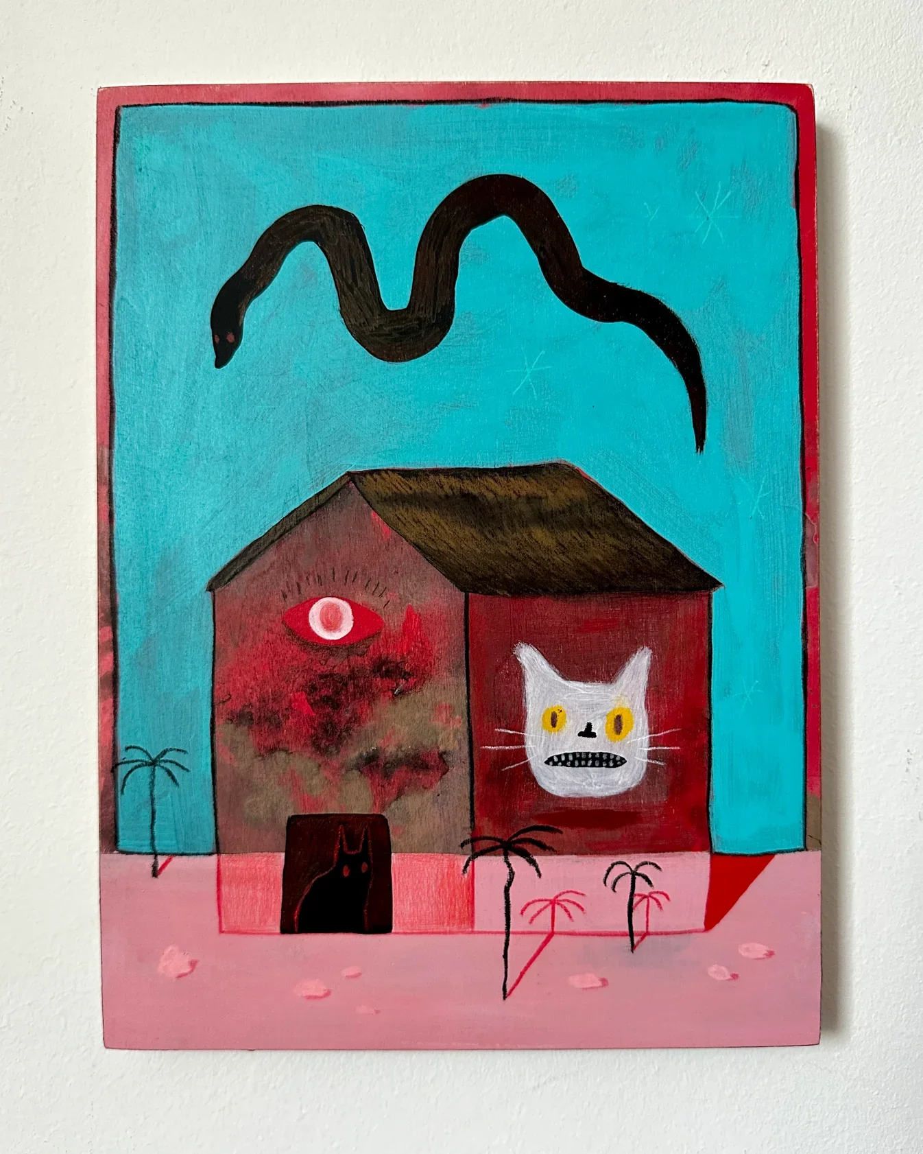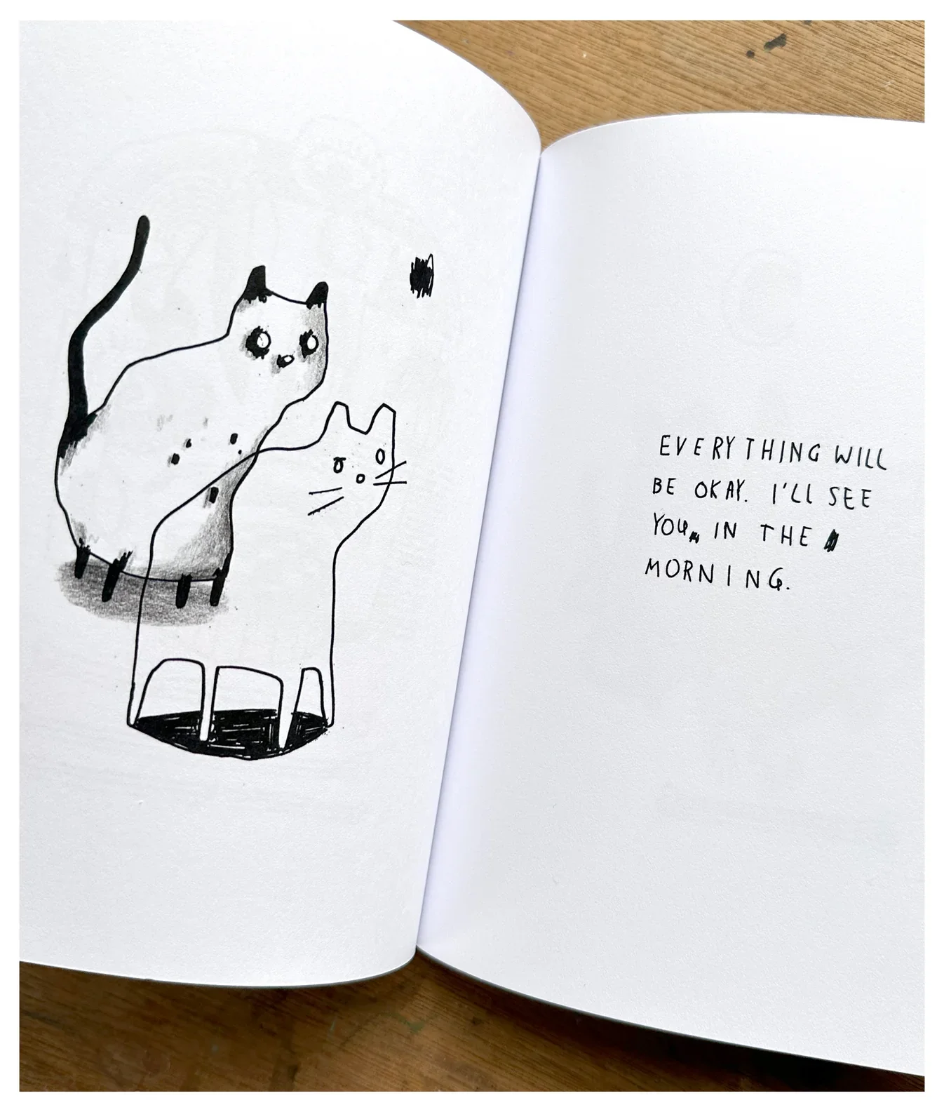 Another recurring symbol in his recent work is cats, as cat people we love this, if anything there should be even more cats in all art… However, spoiler alert, this isn’t a story with an happy ending, “cats became more of a recurring thing when my cat Sammy Davis Jr unexpectedly passed away in 2023. I ended up making a whole book of drawings and writings while processing it. It’s strange how these things just take hold of you.” Losing a loved one is devastating; we also had a cat that unexpectedly passed, and there isn’t a day that goes by, where we don’t talk and think about her. Cats, or any pets, are magic and are a constant source of inspiration.